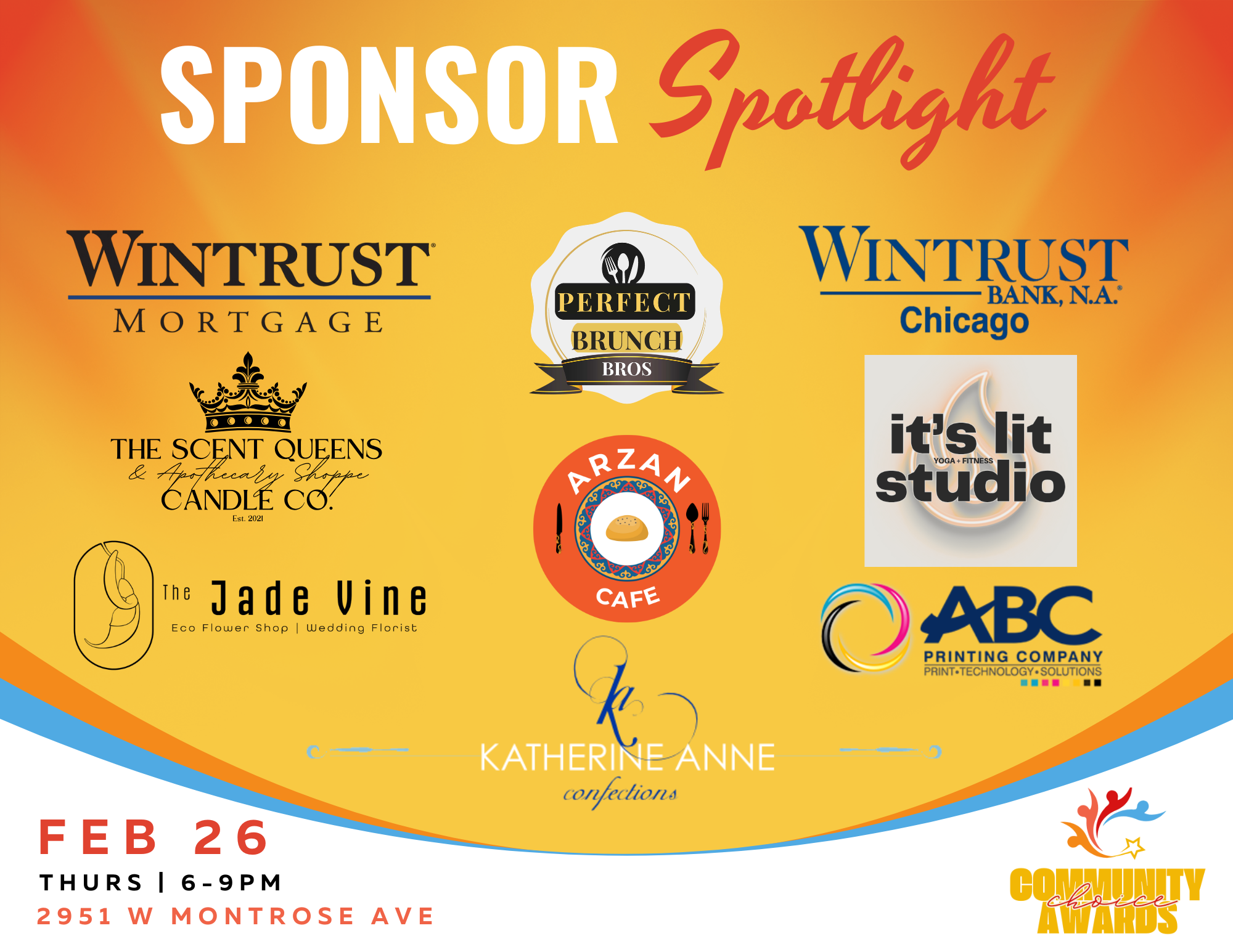 The Community Choice Awards is made possible by our generous sponsors! Your support helps cover venue costs, food and beverages, photography, and event staff, while showcasing your organization’s commitment to small businesses.